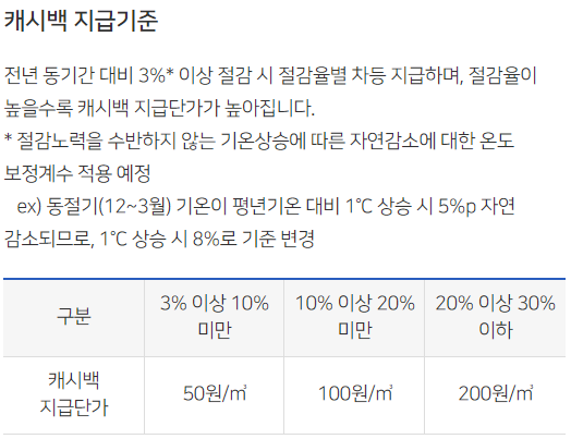 도시가스 절약캐시백이란 주택난방용 도시가스 요금제 사용자를 대상으로 동절기 도시가스 사용량 감축을 위해 운영하는 제도로 동절기(12~3월) 동안 전년도 사용량보다 3%이상 절약하면 절감량에 따라 현금으로 돌려주는 제도입니다. (30%한도, 10원단위 절사)