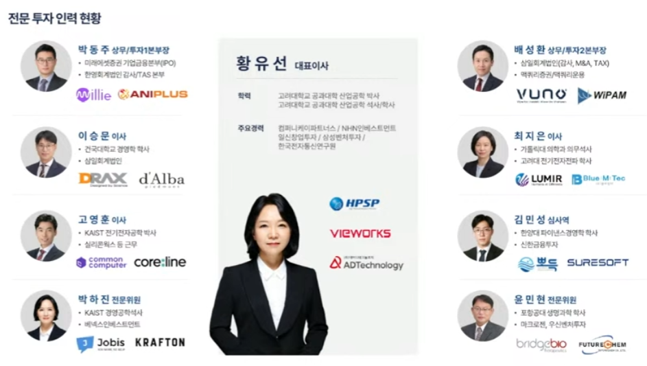 - 다음은 전문투자 심사역의 대한 설명입니다. 대표이사 황유선을 포함한 9인의 심사역은 평균 투자 경력 15년에 이르는 베테랑 투자 심사역입니다.